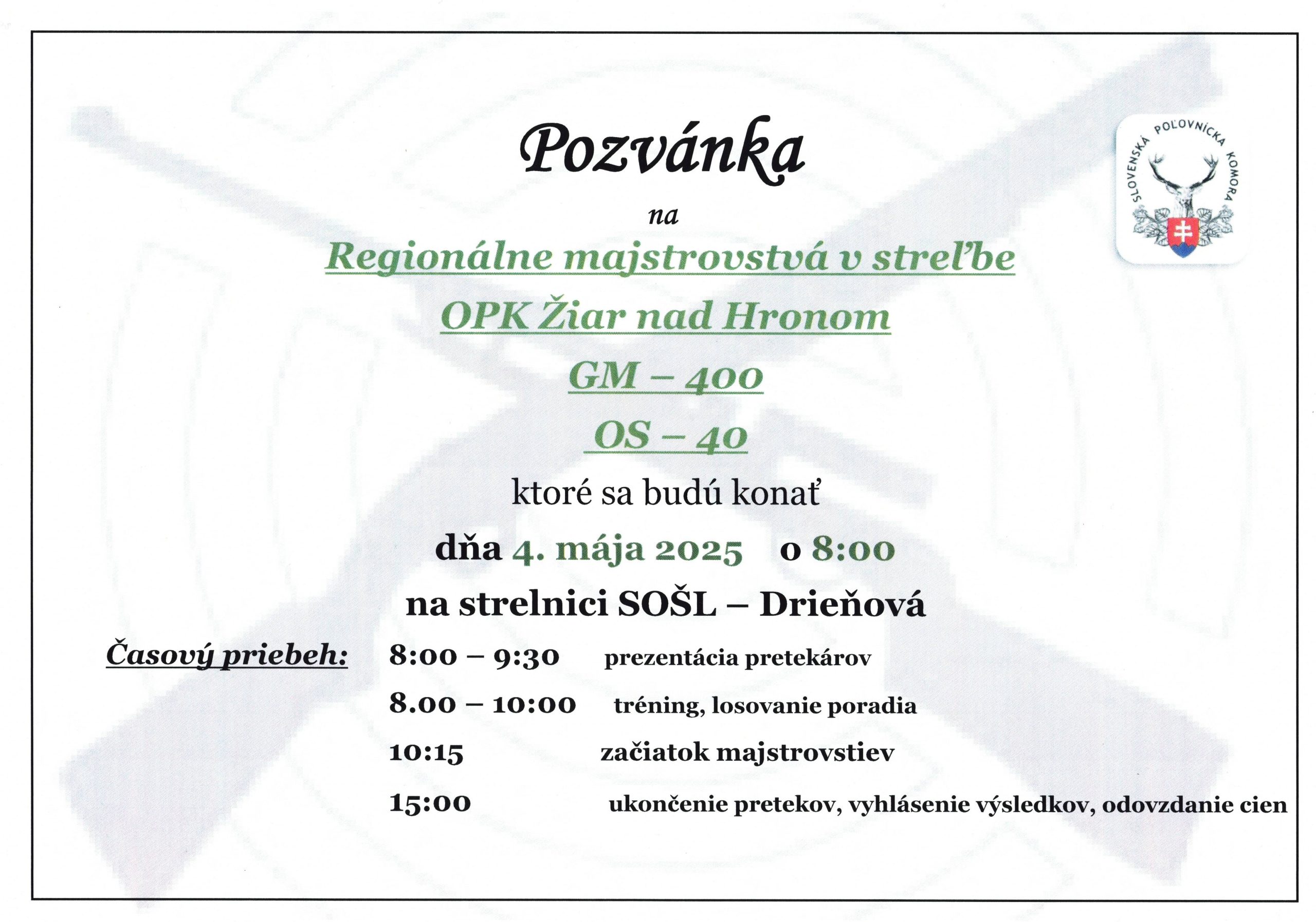 Dňa 4. mája sa na strelnici Drieňová Strednej odbornej školy lesníckej v Banskej Štiavnici uskutočnili Regionálne majstrovstvá OPK Žiar nad Hronom v streľbe M400 a OS40. V disciplíne M400 z celkového počtu 42 strelcov zvíťazil Ing. Róbert Láska s nástrelom 395/400 bodov. V disciplíne OS40 zvíťazil Ing. Ladislav Kružič ml. s nástrelom 36/40 terčov z celkového počtu 7 strelcov.